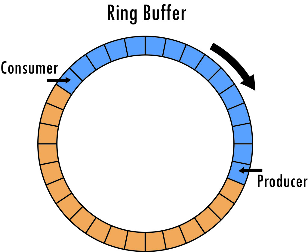 What sets the ring buffer apart is the way it manages its data and the limitations it imposes. A ring buffer has a fixed capacity; it can’t grow and it can’t shrink. Because of that, once the buffer is full, the producer either has to wait for a slot to become free or start stomping over data that hasn’t been consumed yet, depending on how the buffer and the application are designed. Both approaches can be perfectly valid.